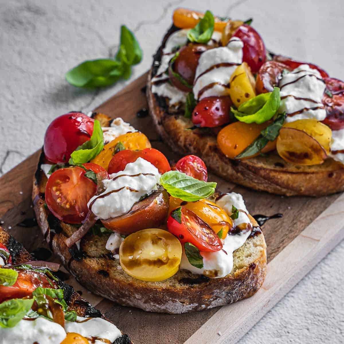 ブルスケッタは、硬い皮の素朴なパンをスライスしてグリルで焼いたイタリアの前菜です。